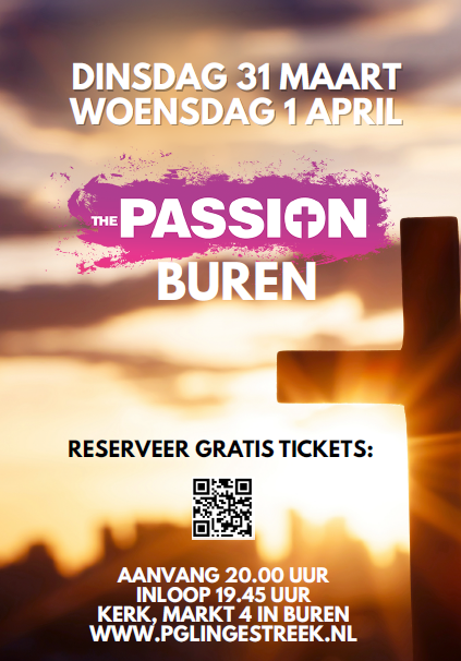 Dinsdag 31 maart en woensdag 1 april is het dan zover: de Passion in Buren. Met een enthousiaste groep mensen zingen we mooie liederen die de lijdensweg van Jezus Christus omlijsten. Dit jaar is onze nieuwe predikant ds. Alex Brinkman de verteller. De jongeren verzorgen een paar korte toneelstukjes. Je kunt voor beide data gratis tickets reserveren via de qr-code. Mochten er nog vragen zijn, neem dan contact op met Scarlett Lerrick: scarlett@pglingestreek.nl